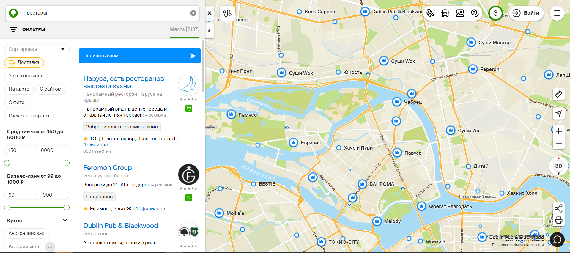 Принцип инструмента простой и похож на рекламу в поисковиках. Когда пользователь набирает в поиске карт запрос, организация рекламодателя показывается выше и заметнее других компаний — конечно, если запрос соответствует тематике бизнеса.