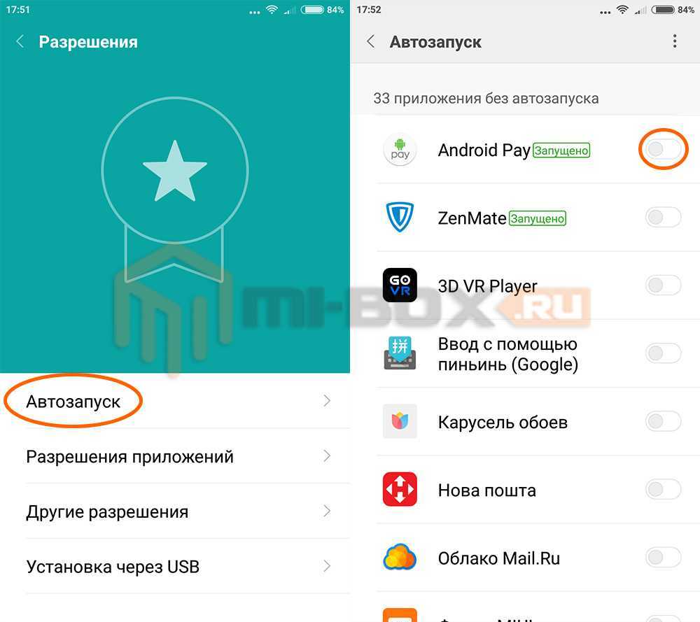 Для этого заходим в настройки смартфона и в разделе “Разрешения” нажимаем на пункт “Автозапуск”. Среди доступных приложений ищем Android Pay и активируем переключатель возле него.