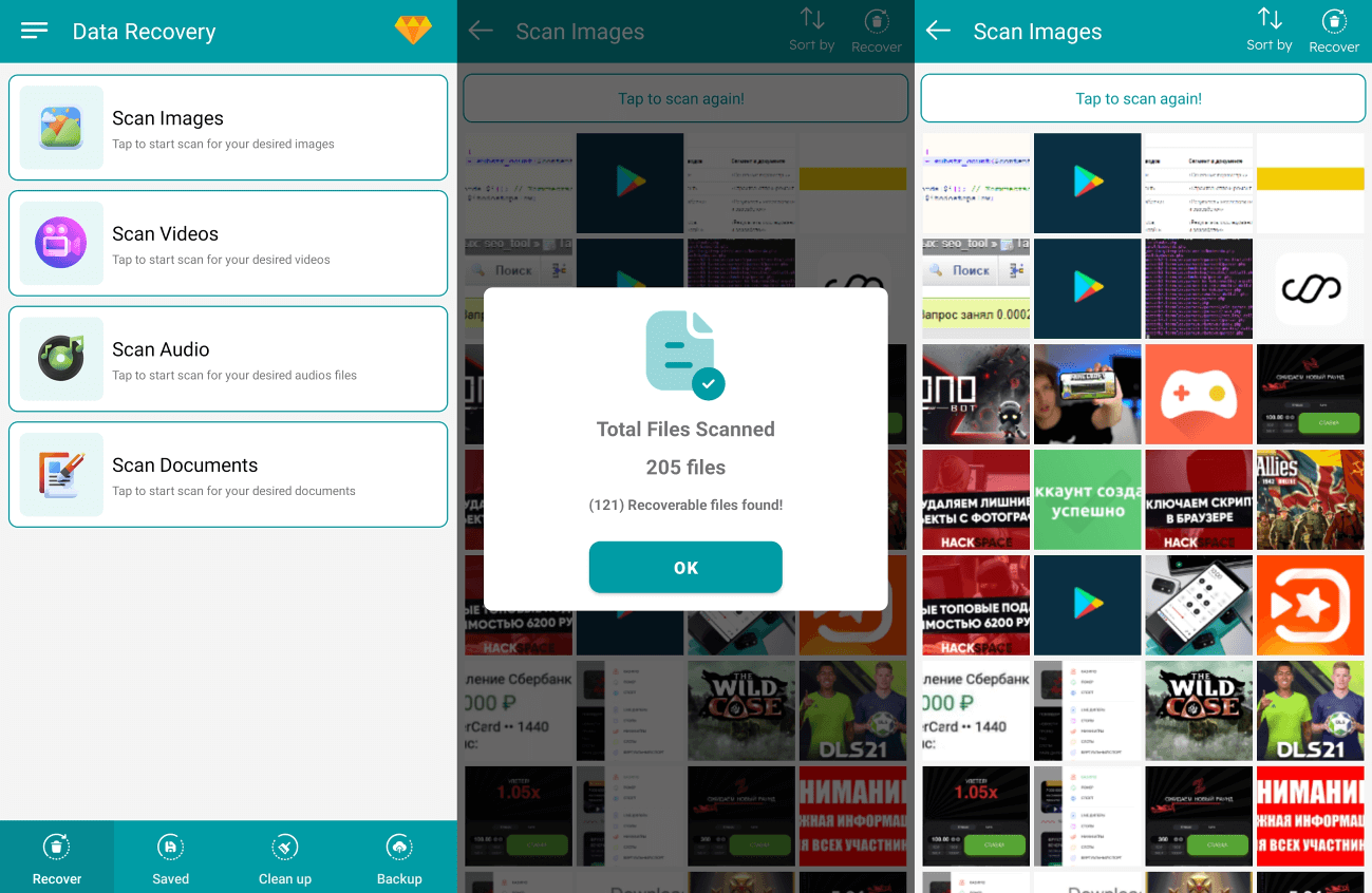 Мне не очень хотелось добавлять это приложение в список. Из-за общего названия много информации о нем я не нашел, но в Google Play у него высокий рейтинг, поэтому я решил дать ему шанс. Создатели рекламируют его как программу, которая умеет восстанавливать всё что угодно, от изображений и важных документов до видео- и аудиофайлов.
