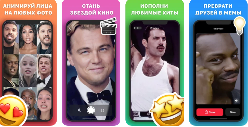 Это первый аналог для Андроида. В создании анимированного живого фото MugLife практически не уступает Avatarify. Здесь тоже много GIF, которые можно взять за образец. Есть вся палитра эмоций, можно копировать знаменитостей и также выбрать вариант, где лицо поет.