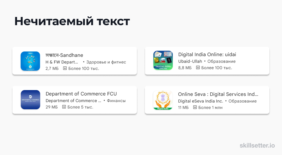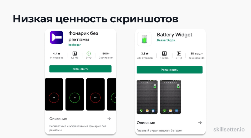 Пользователи выбирают приложение по названию, иконкам, скриншотам, рейтингу и отзывам, а описания обычно не читают.