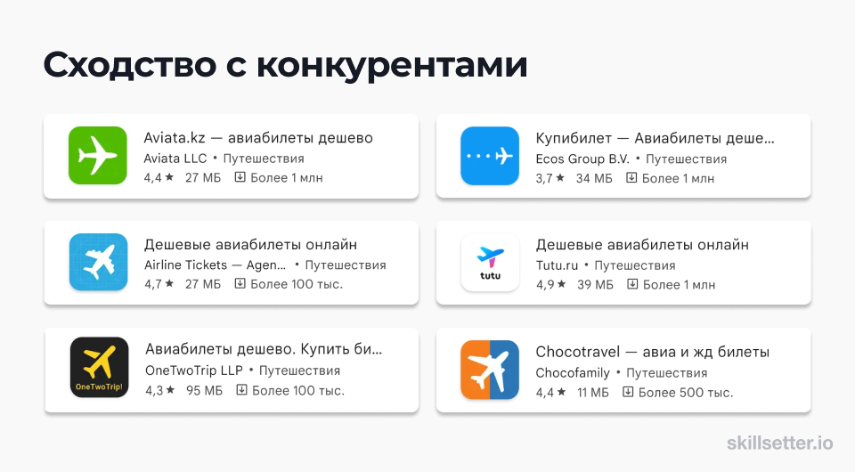 Не сливаться с конкурентами. Многие приложения для покупки билетов используют изображение самолета, поэтому в этом случае лучше сделать что-то оригинальное.