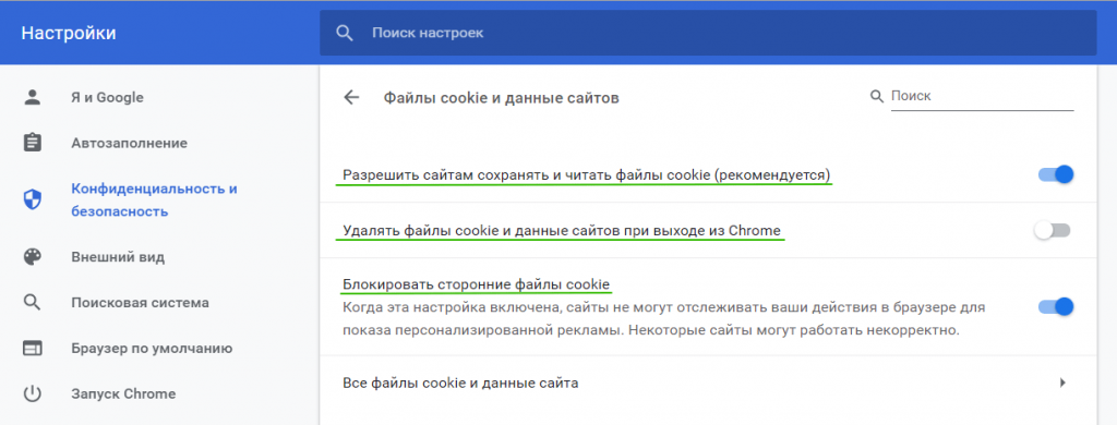 - В разделе «Cookie-файлы» установите переключатель в положение Разрешены: