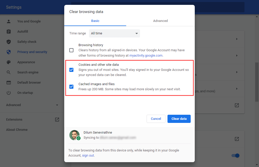 Откройте меню Chrome и выберите «Настройки»> «Конфиденциальность и безопасность»> «Очистить данные просмотра». Затем установите флажки рядом с «Файлы cookie» и другие данные сайта и Кэшированные изображения и файлы, установите «Временной диапазон» на «Все время» и выберите «Очистить данные».