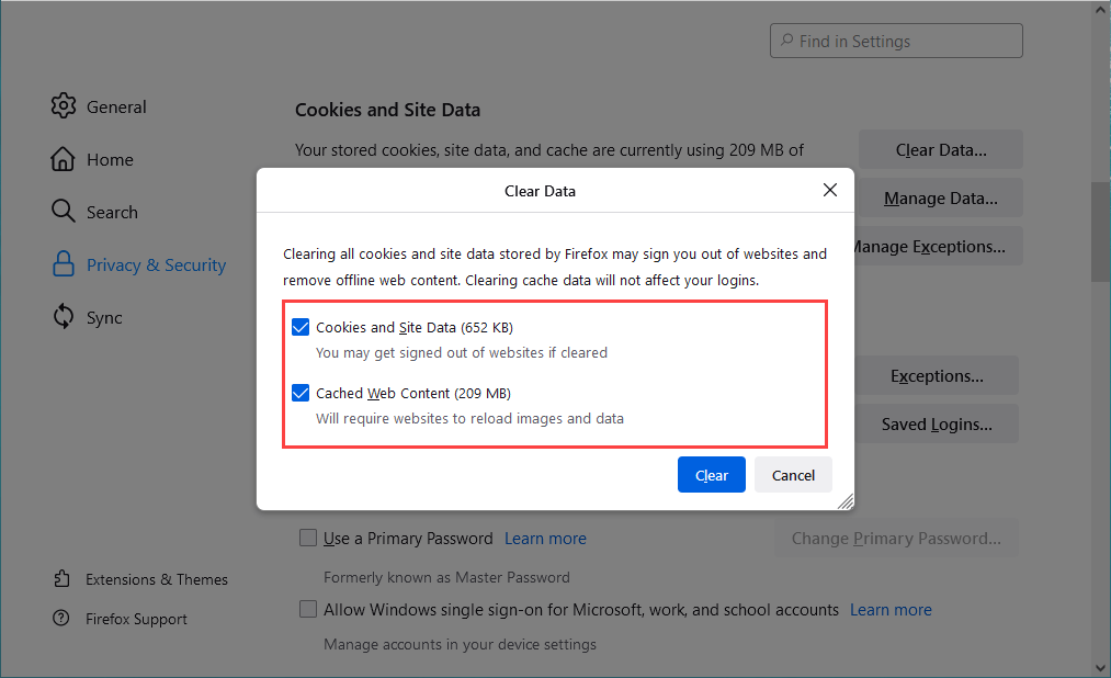Откройте меню Firefox и выберите «Настройки»> «Конфиденциальность и безопасность»> «Файлы cookie и данные сайта»> «Очистить данные». Затем установите флажки рядом с «Файлы cookie», «Данные сайта» и «Кэшированный веб-контент» и выберите «Очистить».