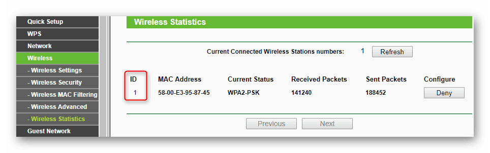 Для того, чтобы узнать, сколько клиентов подключено на данный момент к вашему устройству, необходимо зайти в панель управления роутером во вкладку «Wireless — Wireless Statistics». В таблице значение ID показывает порядковый номер устройства, подключенного в сеть: