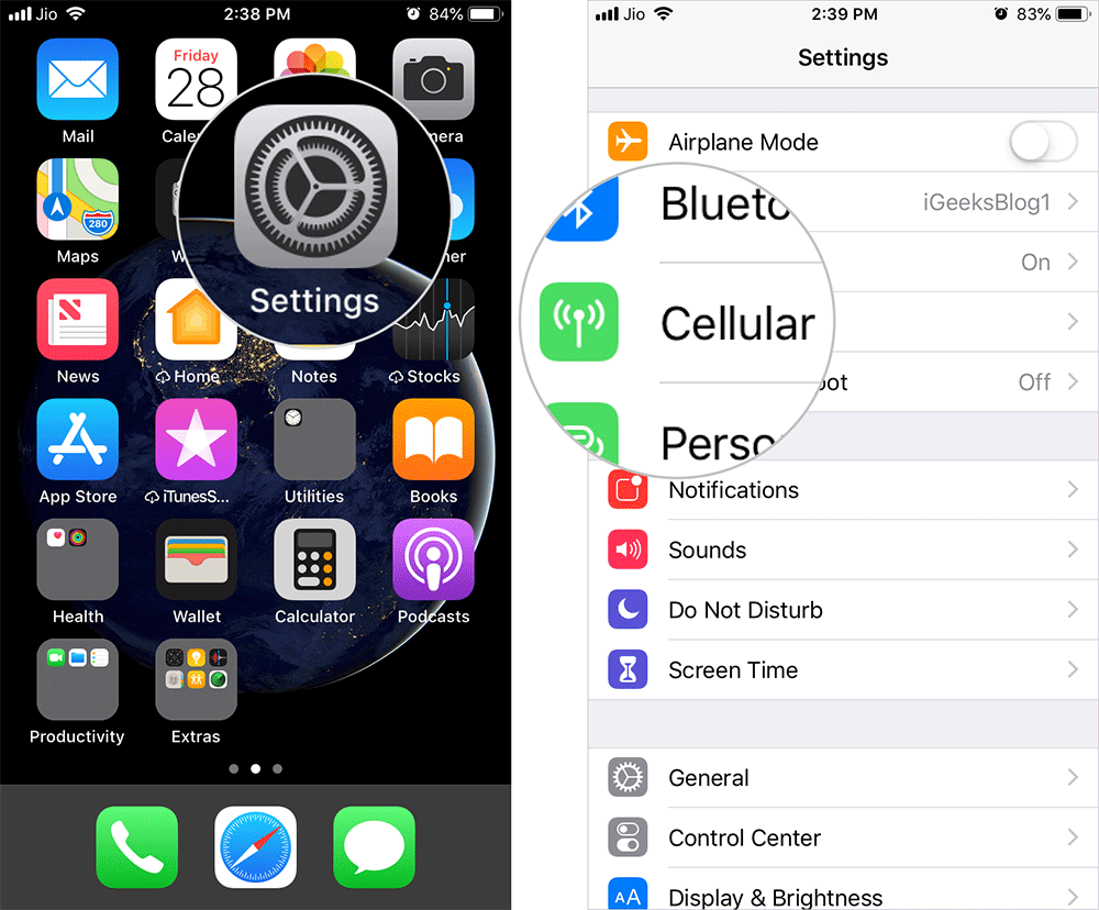 Шаг 1. Запустите приложение «Настройки» → Прокрутите вниз и нажмите «Сотовая связь».