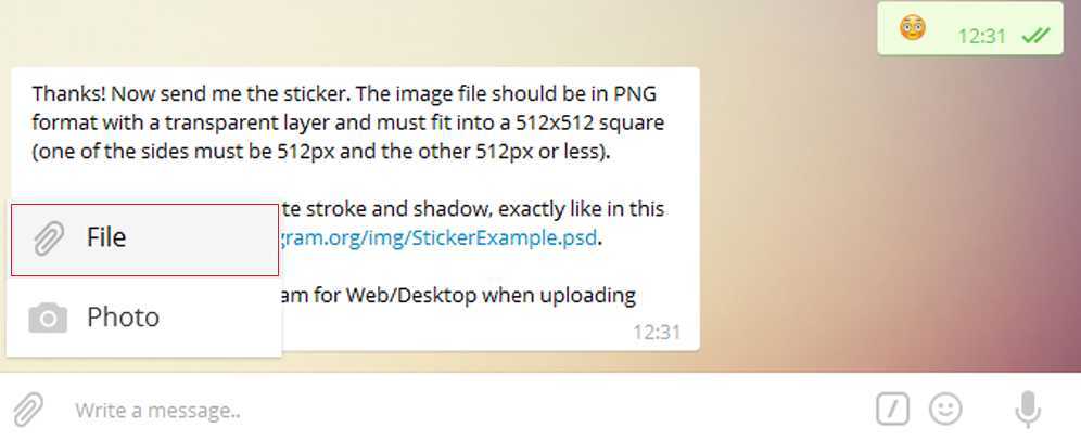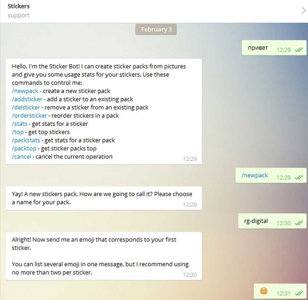 Выбираем первую команду и отправляем ее боту. Далее он предложит выбрать имя для нового пакета стикеров (просто введите название в строке чата и нажмите клавишу ввода), а следом прислать эмодзи, которое будет соответствовать первому стикеру.