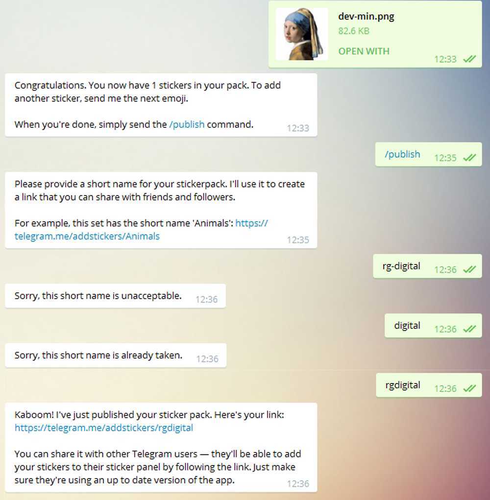 Для того чтобы опубликовать новый набор, отправьте команду /publish. В ответ бот предложит придумать короткое название (с ним могут возникнуть проблемы) ссылки, которую в дальнейшем можно будет отправлять друзьям или публиковать в соцсетях. Разумеется, она будет вести на авторский пакет стикеров.