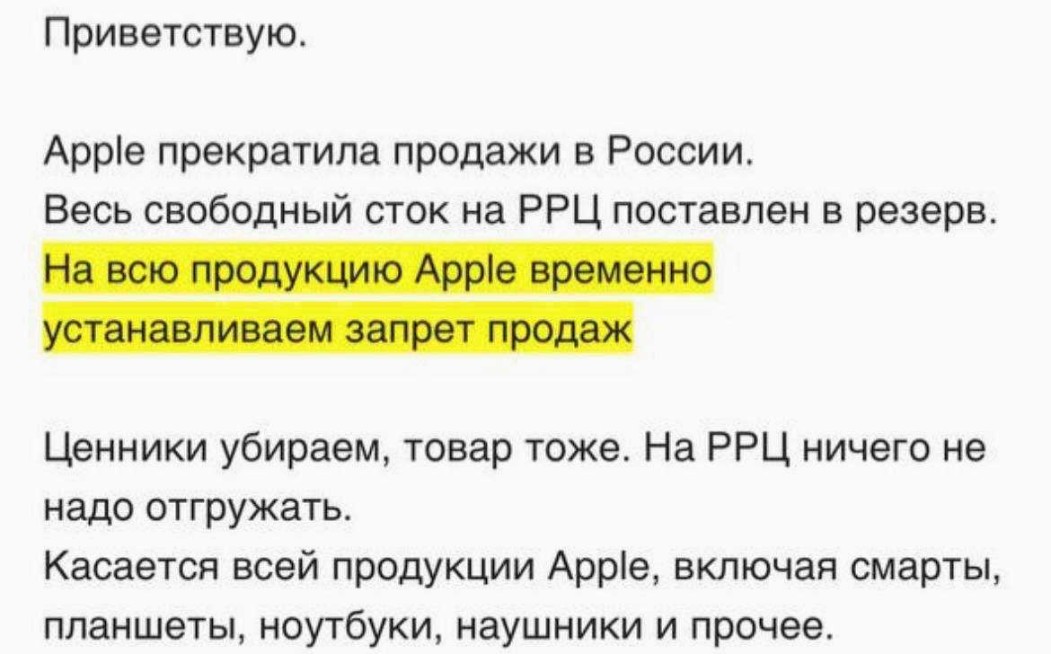 Спрашиваю консультанта: «Всё-таки запретили продавать технику Apple?». В ответ: «Запретили…». Сотрудники подтвердили письмо, которое сегодня появилось в интернете и сказали, что рассылка пришла в рабочие чаты около 4 утра.
