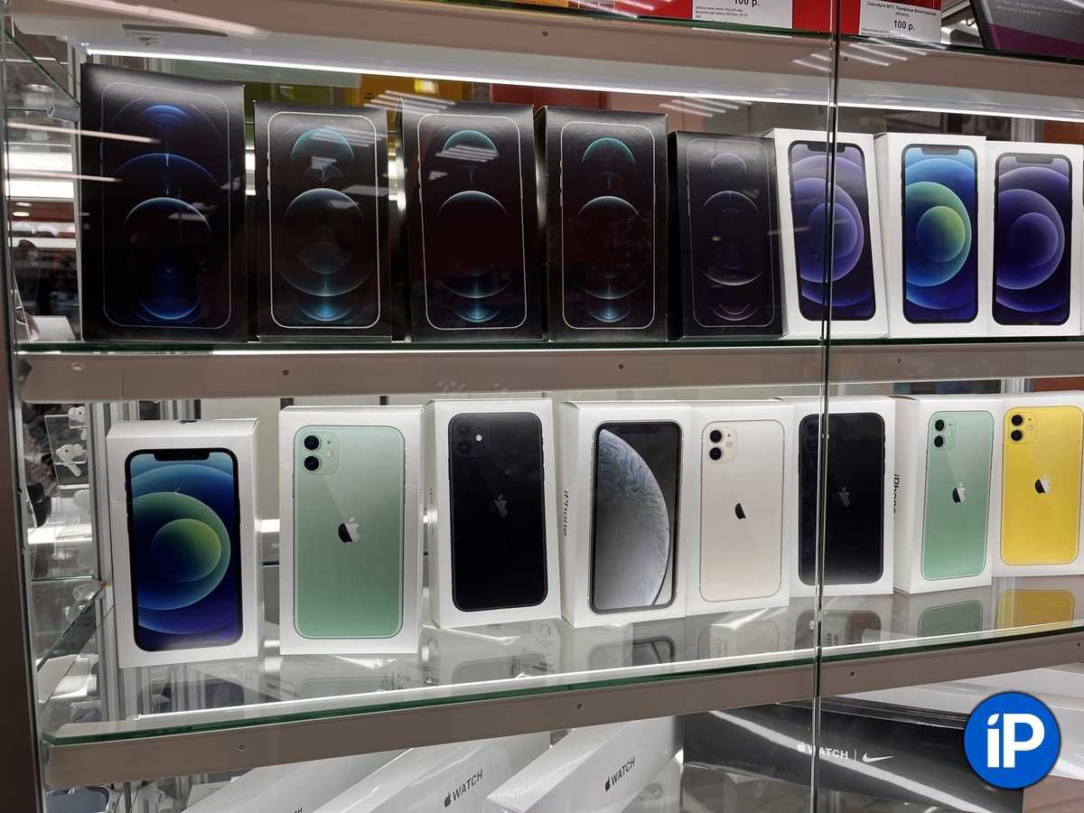 Хоть на витринах и есть коробки от iPhone, Apple Watch, iPad и фирменных аксессуаров, но купить их нельзя. Кассовая система просто не позволяет считывать их штрих-коды или добавлять соответствующие товары в корзину.