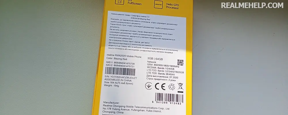 Компания Realme не указывает на своих упаковках версию телефона. Поэтому определяем ее только по полиграфии. На коробке от международной версии все надписи на английском. Еще может быть наклейка с продублированной информацией на языке страны, в которой продается устройство. Если у вас China, будут только иероглифы. Аналогичная ситуация с инструкцией.