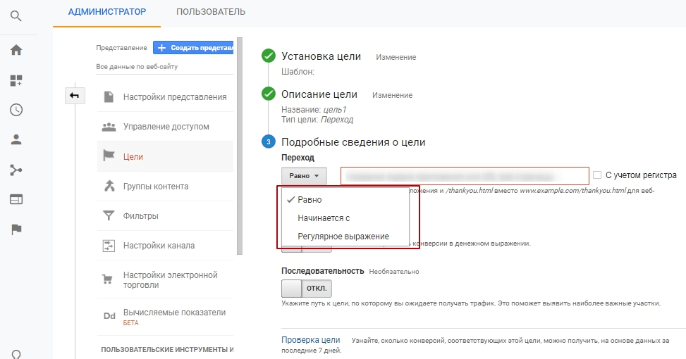 Делаем вывод, что нам подходит тип соответствия «Начинается с». В этом случае будут фиксироваться все переходы по точному URL, а также по URL, содержащим любые метки или идентификаторы после основной ссылки.