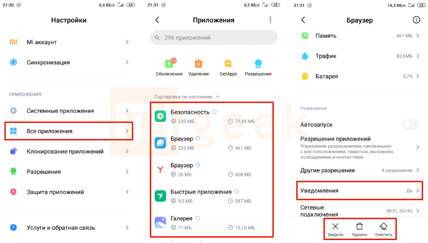 Удаление приложений и отключение уведомлений