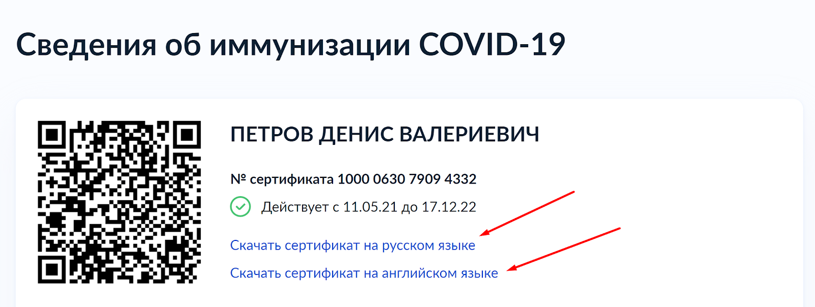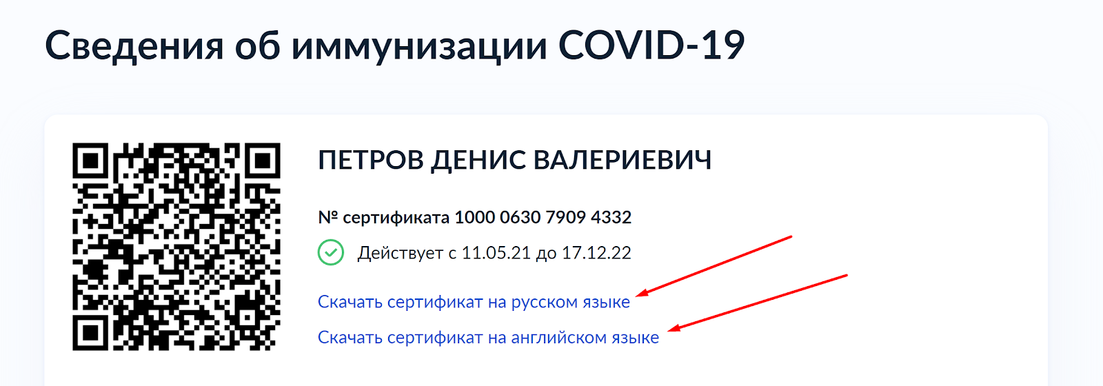 Этот код можно скачать, распечатать или загрузить на смартфон. И тогда при наведении смартфона на QR-код открывается страничка сайта госуслуг, на которой видно, что вы имеете сертификат и он действителен.