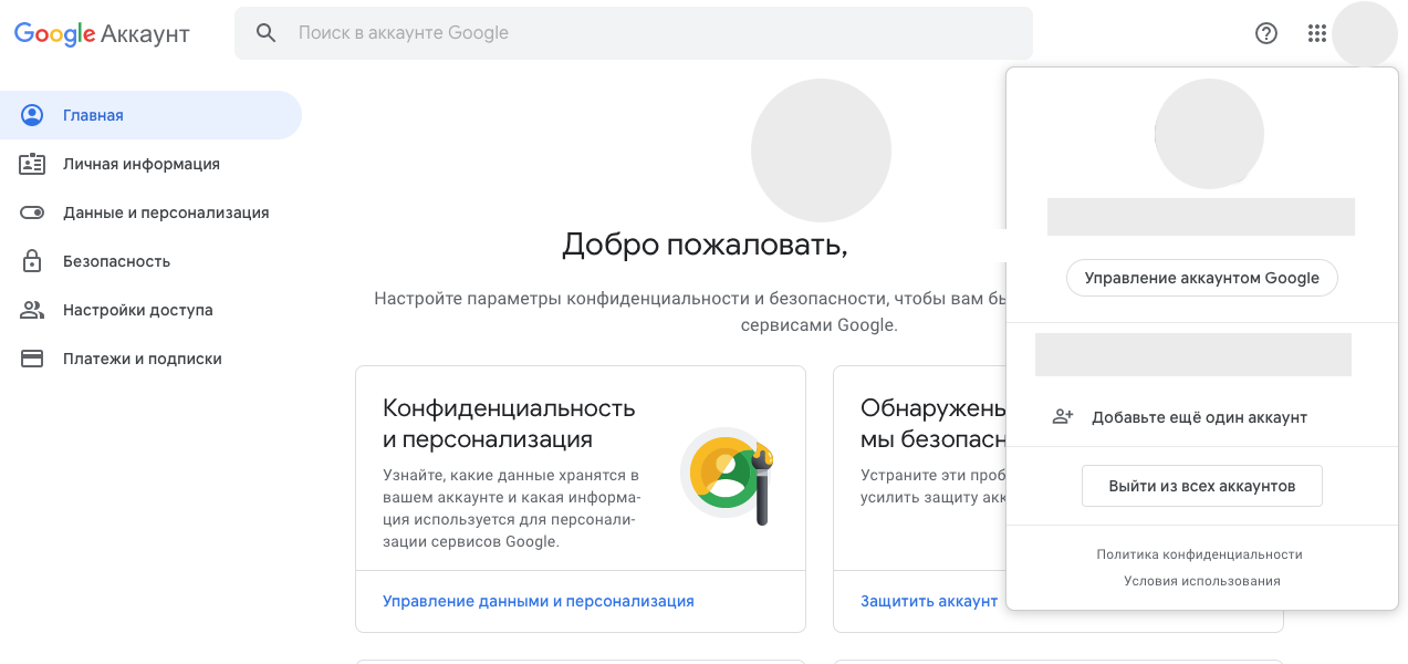В настройках google-аккаунта вся информация распределена в трёх основных разделах «Безопасность и вход», «Конфиденциальность» и «Настройки аккаунта».