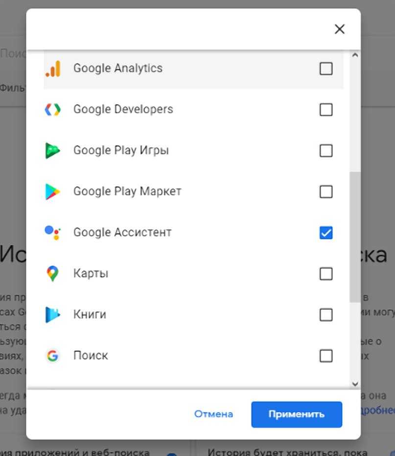 Чтобы увидеть только историю взаимодействия с голосовым ассистентом от Google, вам придется настроить соответствующую фильтрацию. Для этого поставьте галочку напротив пункта «Голосовое управление» и «Google Assistant», выберите интересующий вас промежуток времени и нажмите кнопку «Применить».