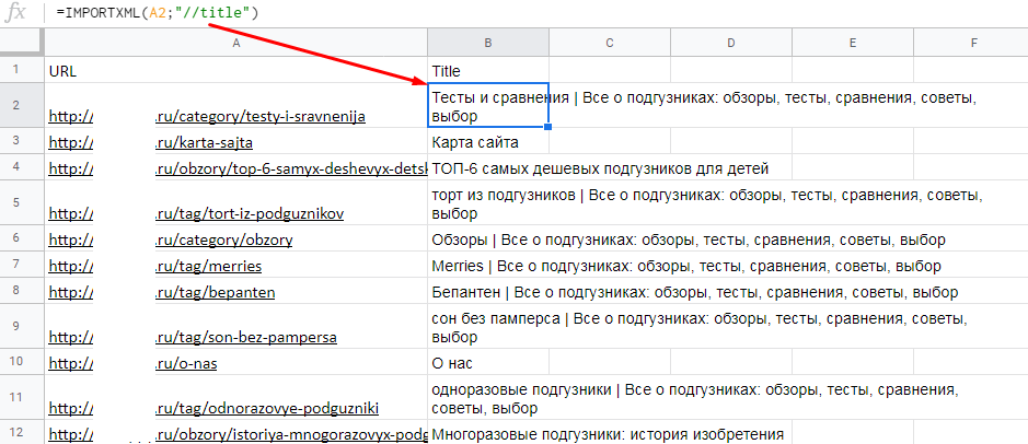 - В первой ячейке соседнего столбца прописываем формулу IMPORTXML: =IMPORTXML(A2; «//title»).