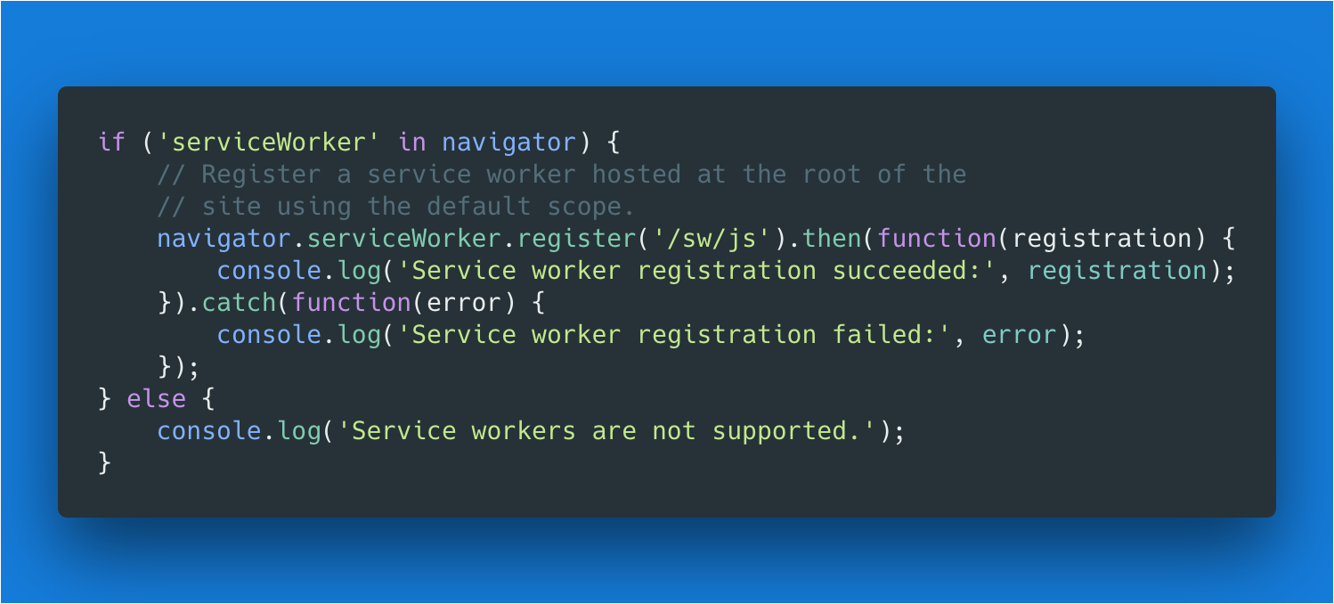 Чтобы установить сервис воркер, вам необходимо запустить процесс, зарегистрировав его, чтобы ваше приложение узнало, где действительно работает сервис воркер.