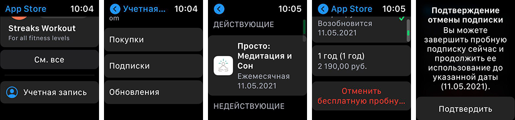 У меня действующих нет, последнюю подписку на медитации я отменила через настройки. Но кликаю на нее Так как подписка была отменена до этого и сейчас уже не действующая, кнопки «Отменить подписку» нет
