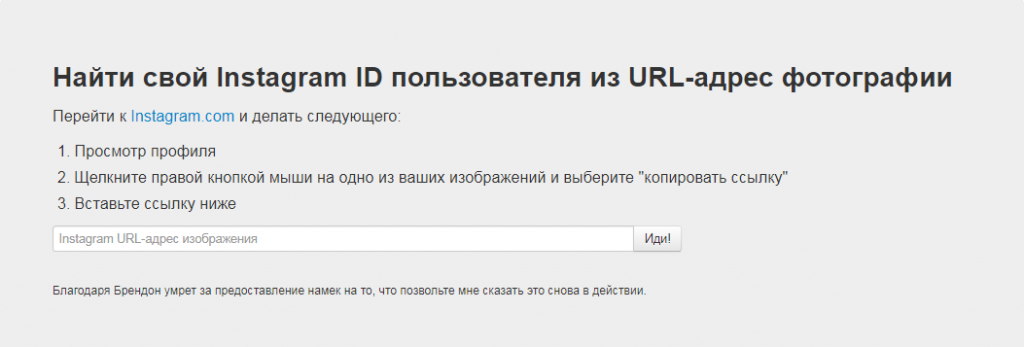 Существует еще один сервис, который позволяет достаточно легко узнать ID Инстаграм-пользователя. Для того чтобы воспользоваться его услугами (бесплатно), нужно выполнить три действия: