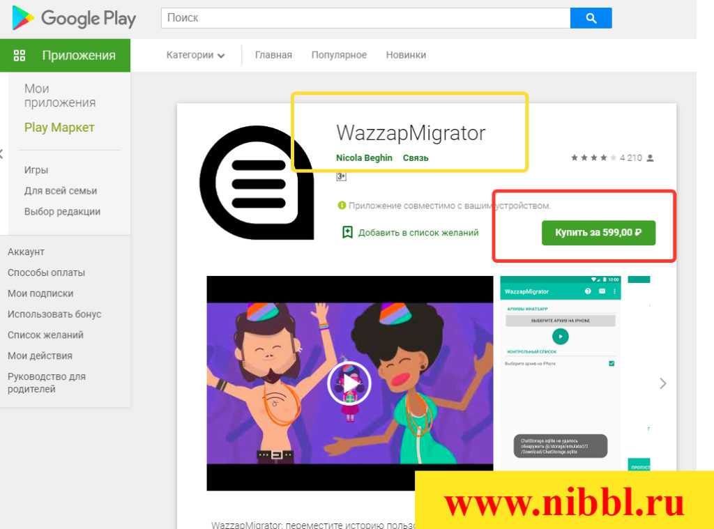 Нам необходимо установить на телефон приложение WazzapMigrator — заходите в Google Play и в поиске набираете WazzapMigrator и нажимаете купить за 599 рублей и дальше по шагам, оплачиваете и переходите к следующему шагу