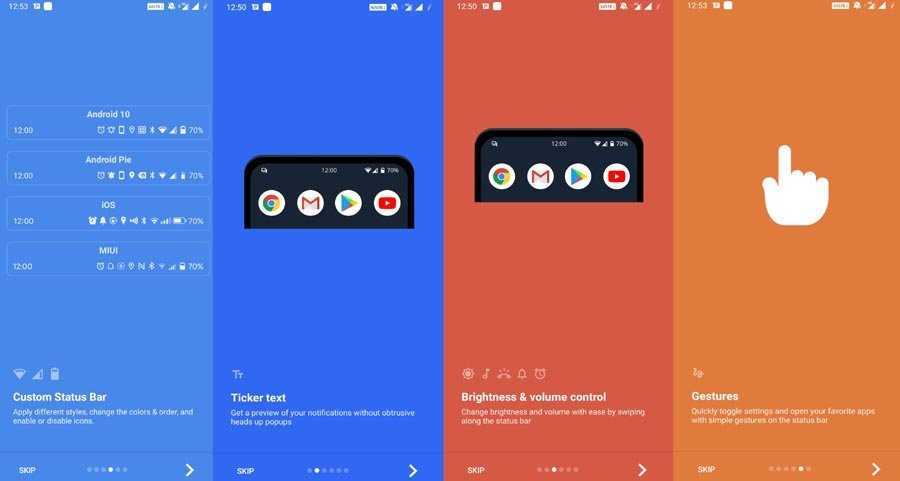 По сути, вы получаете 4 варианта оформления строки состояния. Это варианты на выбор в стиле Android 9.0 Pie. Строка состояния в стиле Android 10, iOS и MIUI.