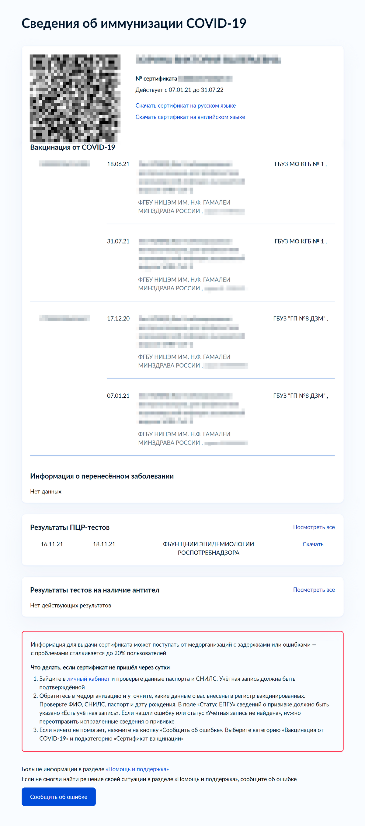 Так выглядит страница с сертификатами. В обновленной версии сертификата указывают данные не только о вакцинации, но и о перенесенном коронавирусе. Скачайте документ или сделайте снимок с экрана. На той же странице — под сертификатом — можно найти сведения о сданных ПЦР-тестах и анализах на антитела.