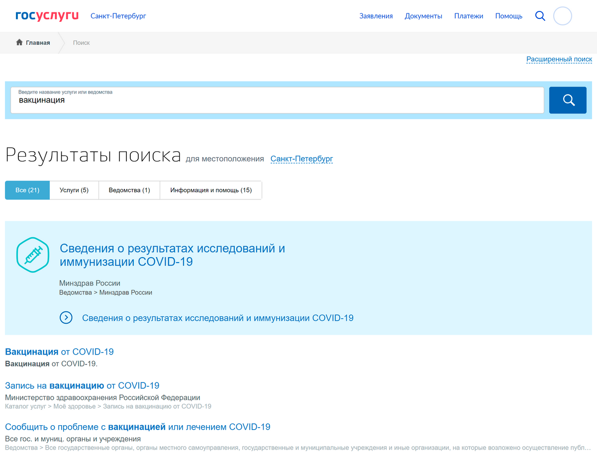 Еще можно найти ссылку на сертификат через поиск. Для этого введите в строке поиска слово «вакцинация»