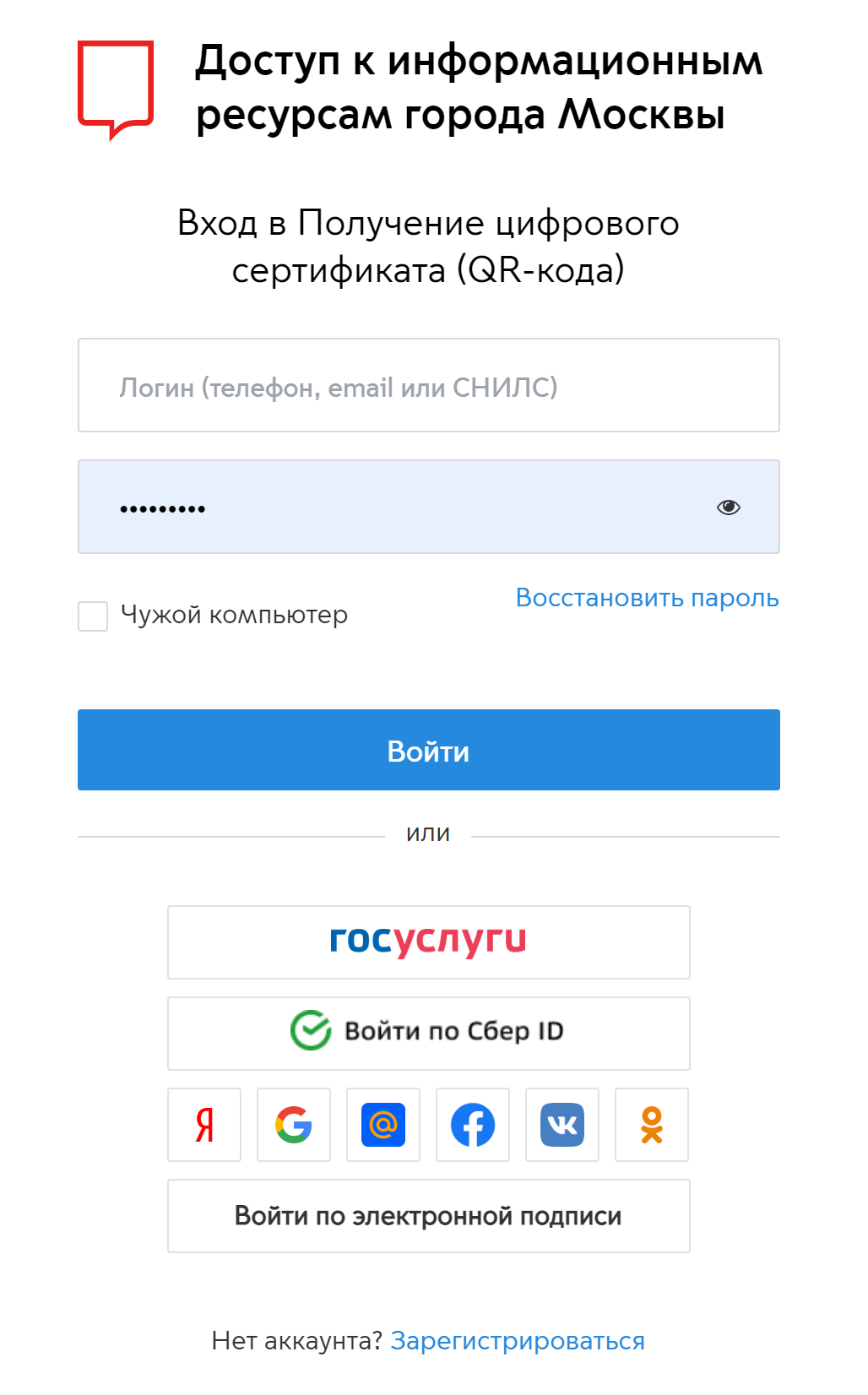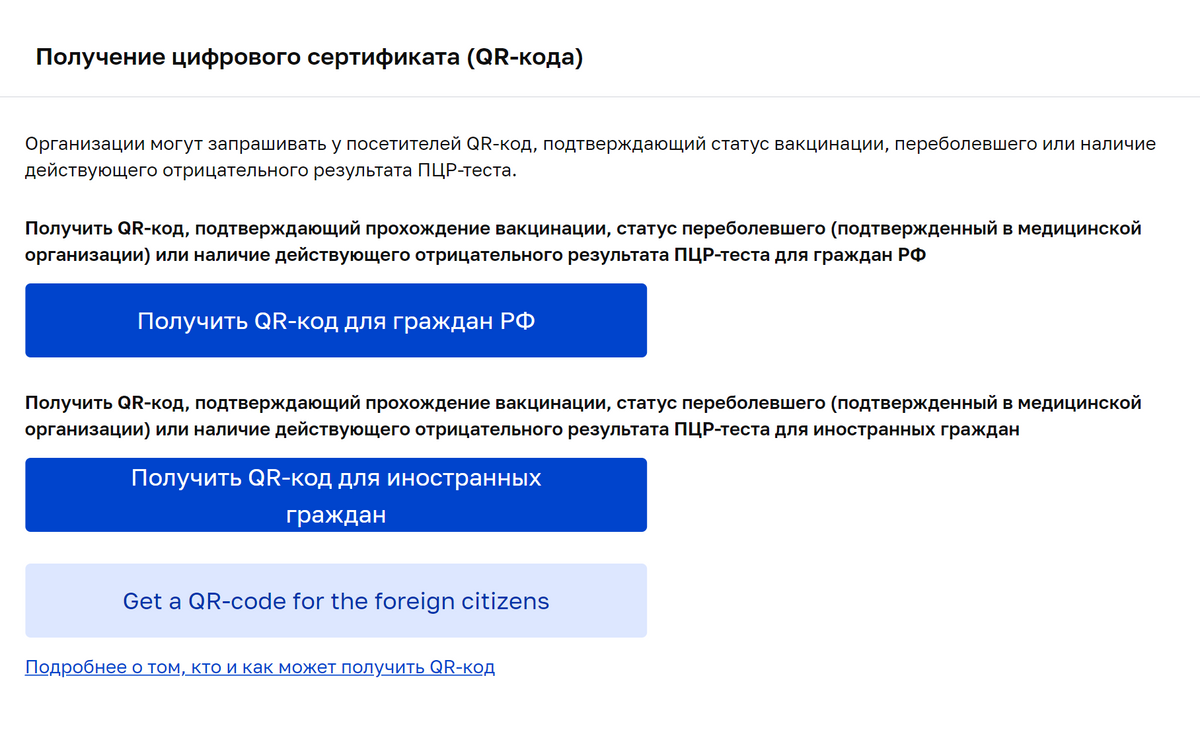На сайте immune.mos.ru выберите пункт «Получить QR-код для граждан РФ»