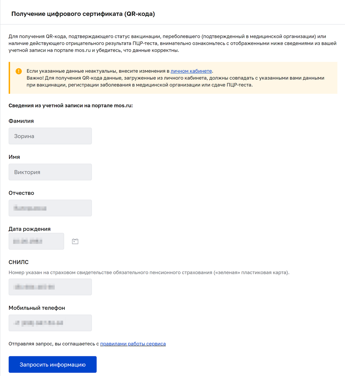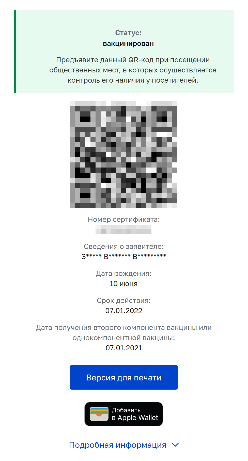 Не нужно бояться, что сайт, который превращает сертификат в карточку для приложения Wallet, получит ваши персональные данные. QR-код защищён таким образом, что не раскрывает ни полного имени, ни тем более паспортных данных. Хоть сайту, хоть проверяющему будут доступны только первые буквы ФИО, а также первые и последние цифры серии и номера паспорта. А вот дата рождения видна целиком.