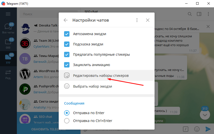 отыскать «Настройки чатов», «Стикеры и маски»;