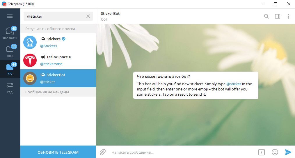- Открываем приложение Telegram и вводим в поиске «Stickers»