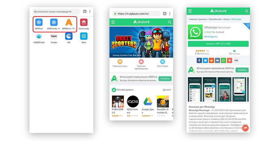 - Загрузка приложений с помощью сторонних инструментов APKPure, APKMirror, APKCombo.
