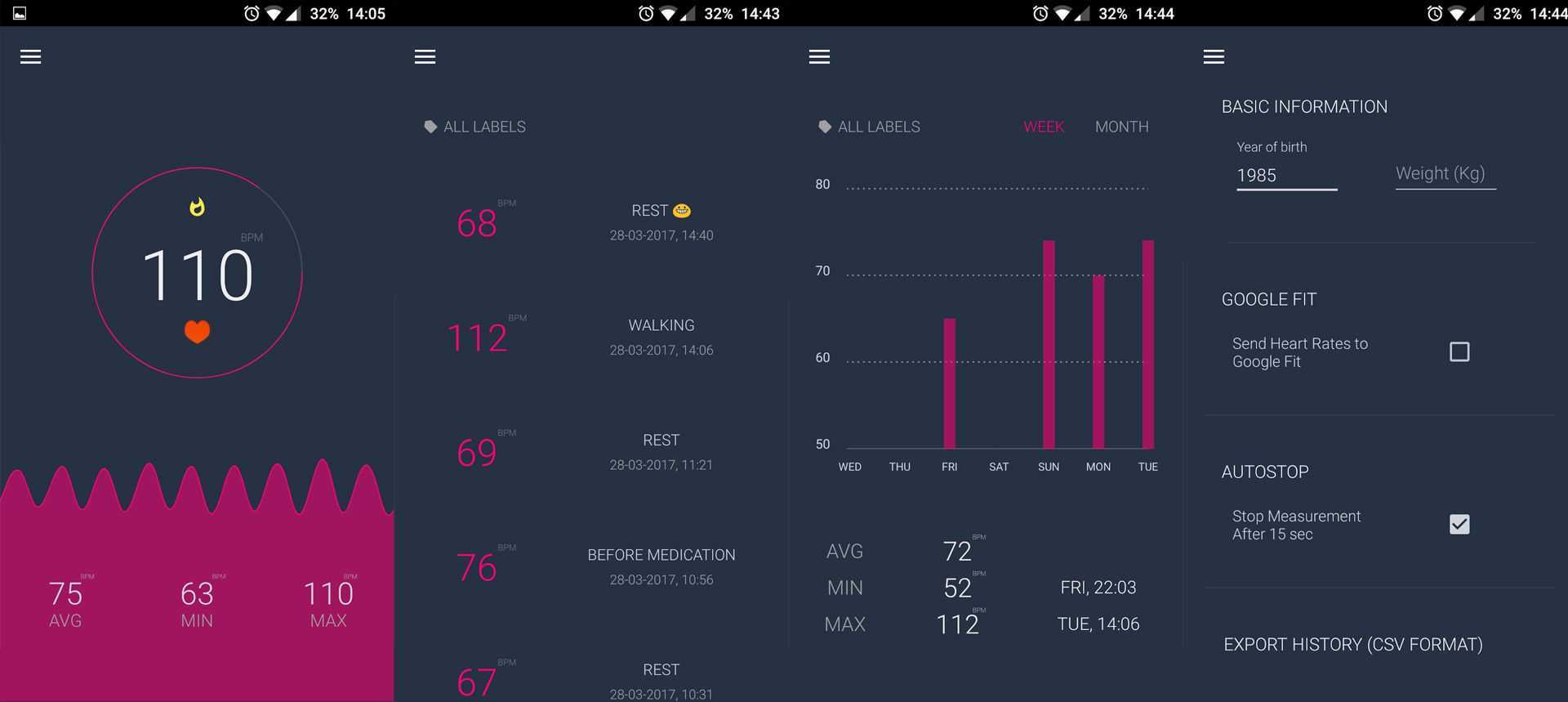 Instant Heart Rate использует метод камеры для определения частоты сердечных сокращений, и все данные отображаются в нескольких диаграммах, которые могут быть разбиты по времени и активности, имевшей место, когда они сделаны. Всю информацию также можно экспортировать для просмотра на других устройствах или поделиться ею.