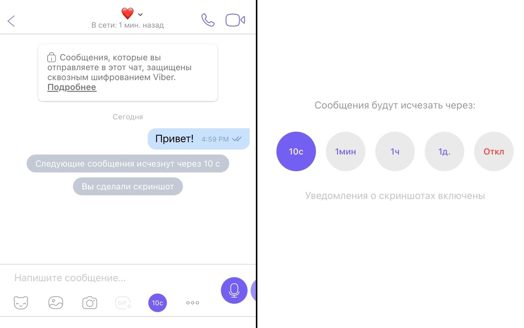 - Исчезающие сообщения — режим, который через установленный пользователем промежуток времени (от 10 секунд до 24 часов) уничтожит переданную информацию и предупредит, если тот, с кем вы общались, сделает ее скриншот.