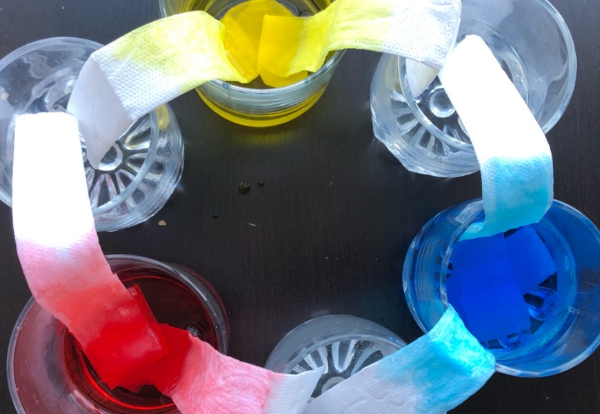 - Соединяем стаканы салфетками и смотрим, как постепенно вода поднимается, а в чистых стаканах формируются цвета.