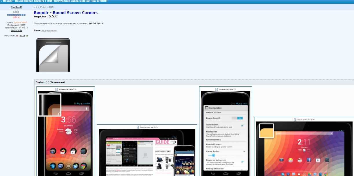 Для получения большего эффекта иногда требуется закругление углов по периметру. Для этого используйте программу, которую можно скачать на 4pda.ru под названием Roundr – Round Screen Corners. С ее помощью можно сделать овальными углы по периметру.