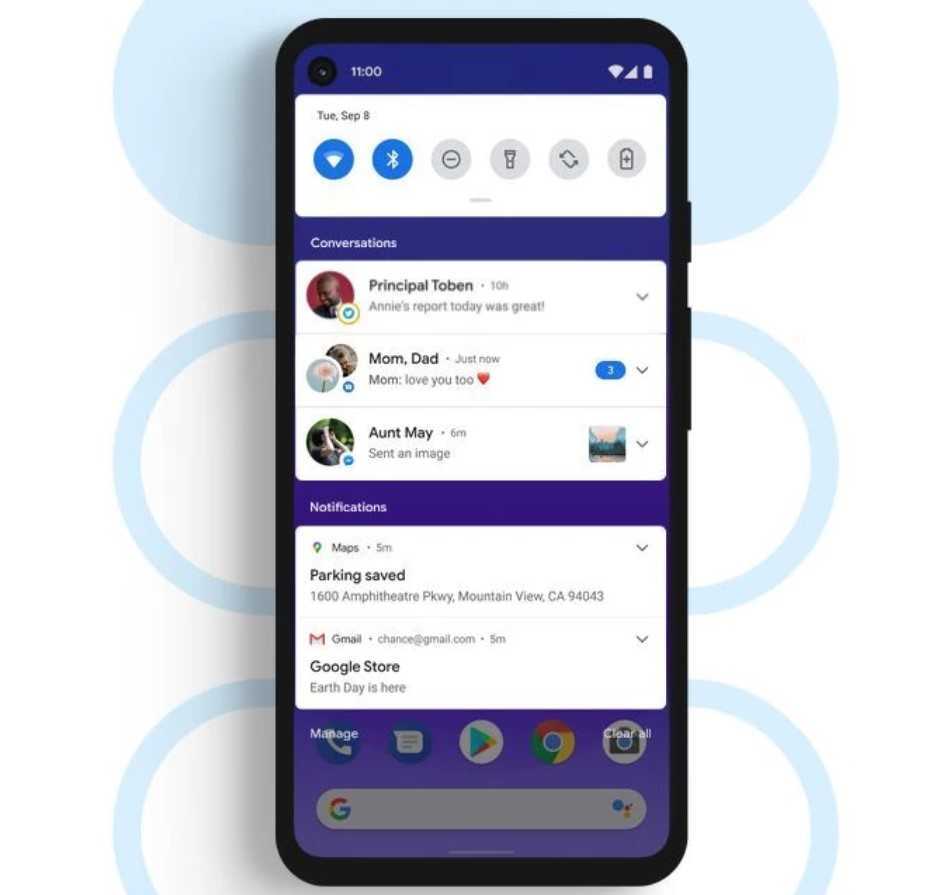 Просмотр сообщений является одним из самых распространенных действий, которые люди делают на своих смартфонах, и Android 11 облегчает их отслеживание. Оповещения от программ обмена сообщениями могут появляться в новом разделе «Разговоры» в шторке.