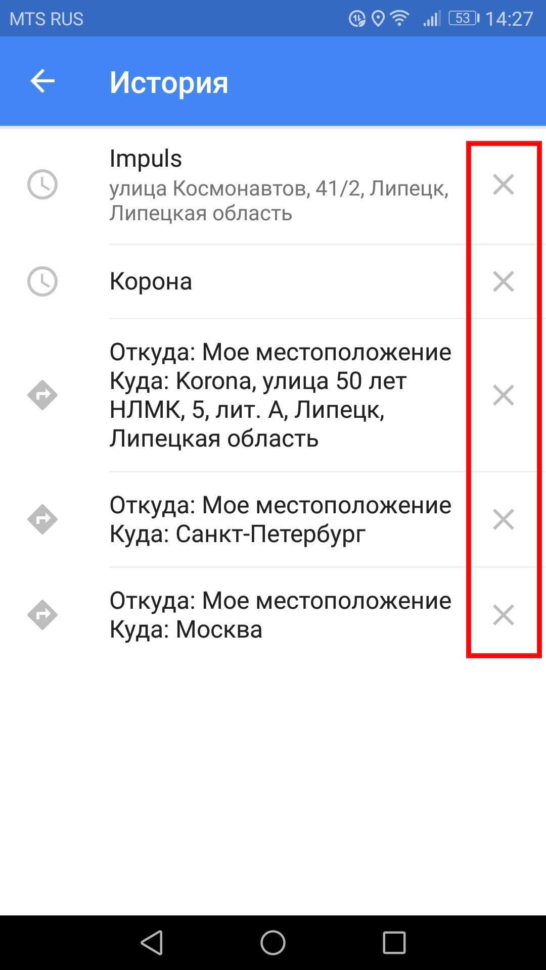 Здесь Вы увидите все маршруты, которыми пользовались при навигации. Невозможно сразу очистить все данные, поэтому Вам придется удалять их по отдельности, нажимая X с правой стороны.