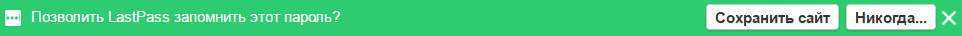 После того, как Вы введете остальные данные для регистрации и нажмете «зарегистрироваться», появится всплывающее окошко вверху страницы, предлагающее запомнить этот сайт в «LastPass».