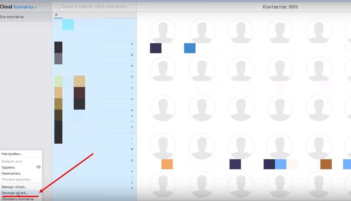 - Щелкните по шестеренке и выберите «Экспорт Vcard»;