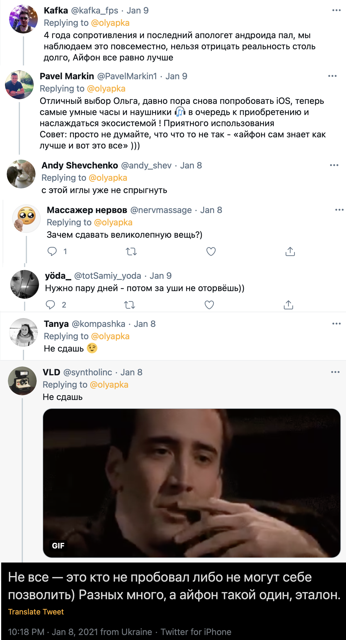 Забавный момент, который стоит отдельной главки в этом рассказе: как меня встретили любители айфонов в соцсетях. На сообщение «протестирую и верну» мне несколько десятков человек ответили «Не вернешь!». Некоторые добавляли, что я наконец-то начала пользоваться тем, чем и было нужно, «купила нормальный телефон». Добавляли, что айфон — это эталонный телефон и венец творения, а андроиды — глючающее нечто. Доводы, что я 5 лет «глючащим нечто» по своей воле пользовалась и мне нравилось, никто не воспринимал.