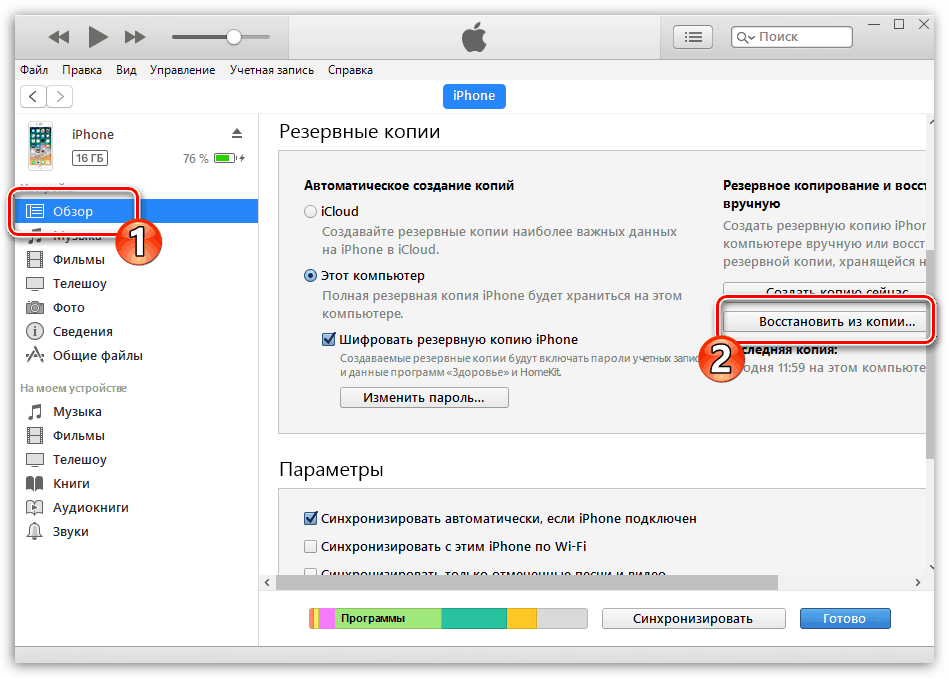 Подробнее: Как создать резервную копию iPhone, iPod или iPad Закончив работу над созданием резервной копии, подключите к компьютеру второй смартфон. Когда Айтюнс найдет устройство, кликните в верхней области окна по иконке с миниатюрой.