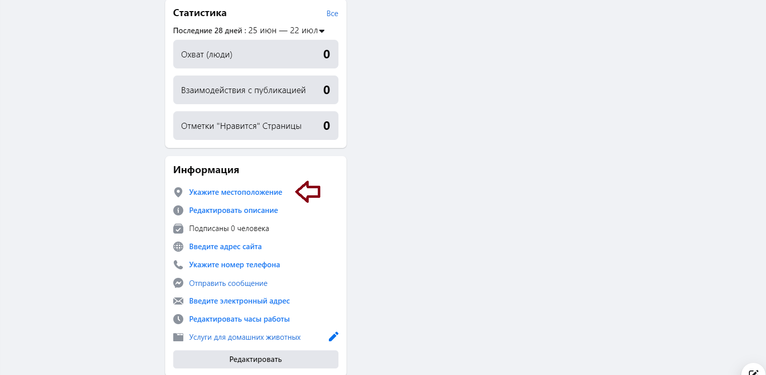 - Теперь нужно открыть вашу бизнес-страницу и пролистать почти в самый низ, где вы увидите раздел «Информация», а там пункт «Укажите местоположение». Выбираете его;