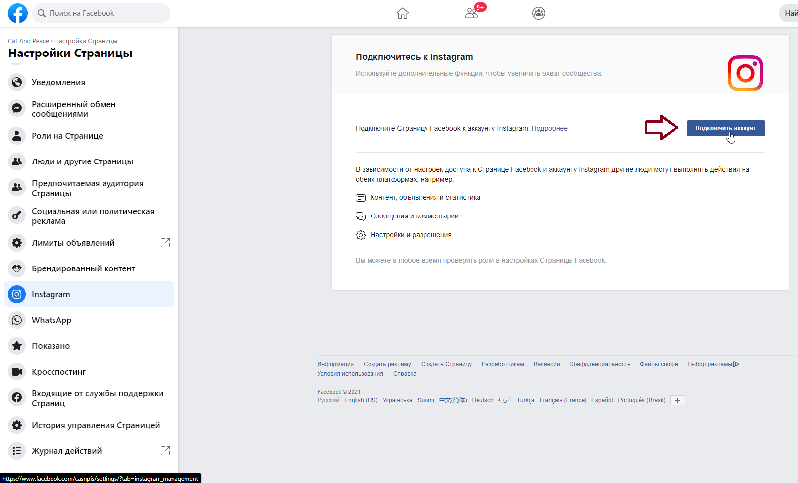 - Нажимаем «Подключить аккаунт». Вам нужно дать все разрешения и связать таким образом ваш Facebook к Instagram;