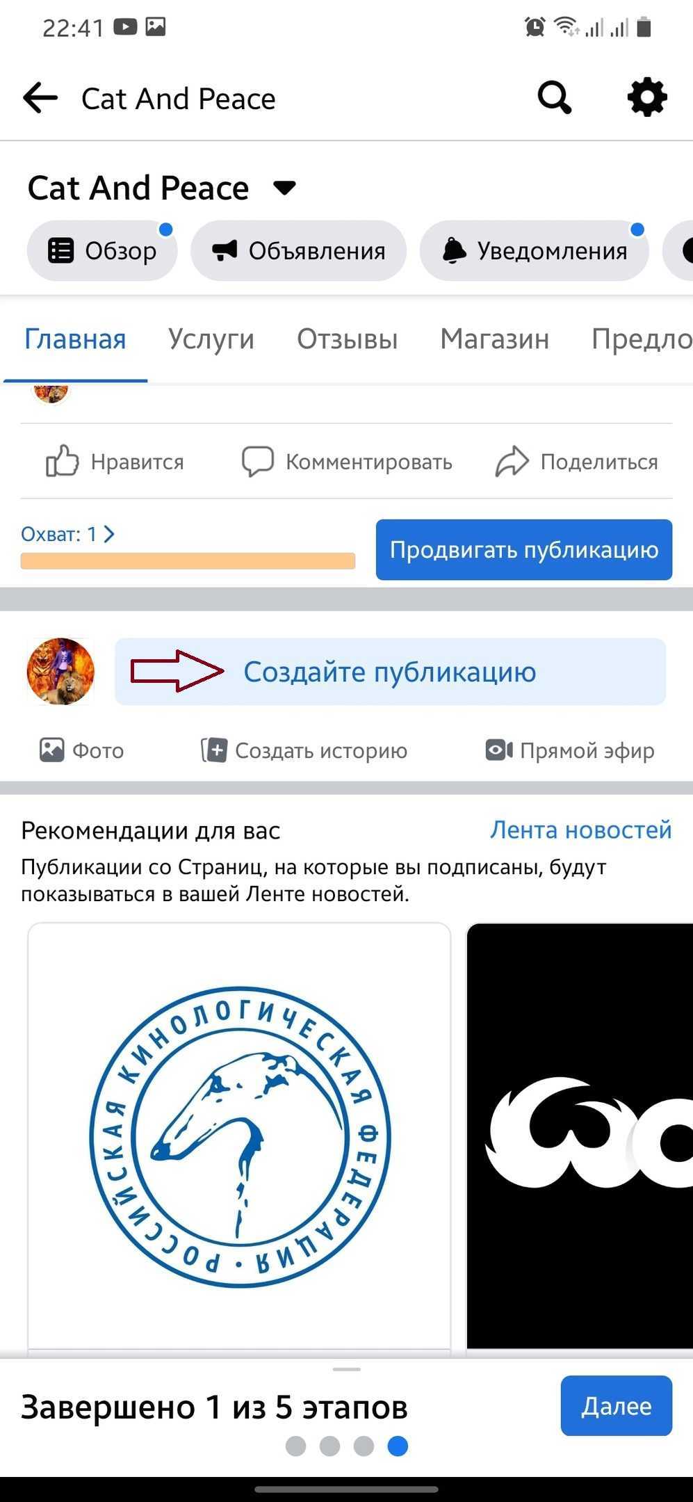 - Заходим обратно на свою бизнес-страницу и создаем публикацию;