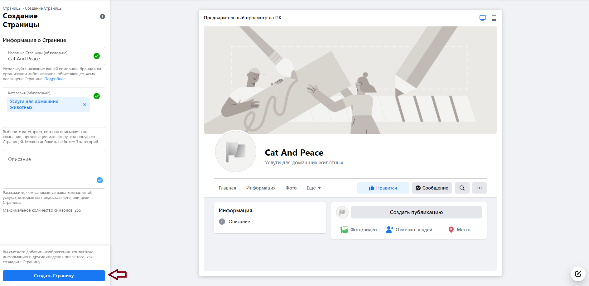 - Придумываете название и категорию, а потом снова нажимаете «Создать страницу» и «Сохранить»;