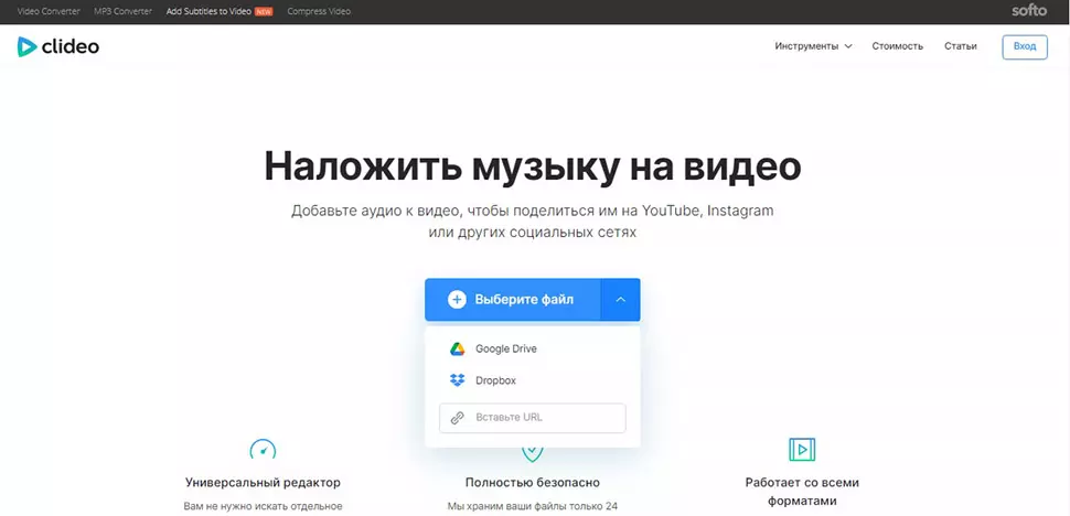Откройте сайт онлайн-сервиса и найдите модуль наложения звука на видео