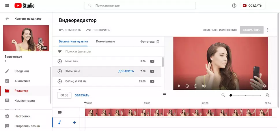 Если вы создаете видеоконтент для YouTube, соединить видеоролик с аудио можно в режиме online в Творческой студии. Хотя сервис значительно ограничил свойства редактирования, все же на сайте можно найти некоторые полезные инструменты, в том числе бесплатную библиотеку музыкальных файлов, свободных от авторских прав. Чтобы добавить музыку в видео на ютубе, сделайте следующее: